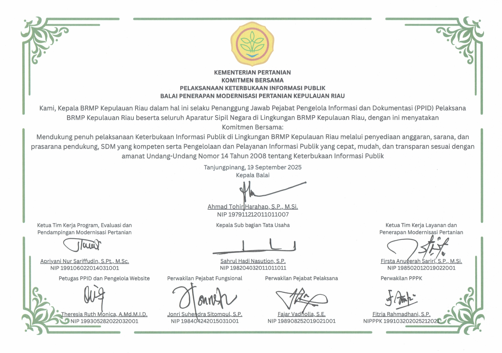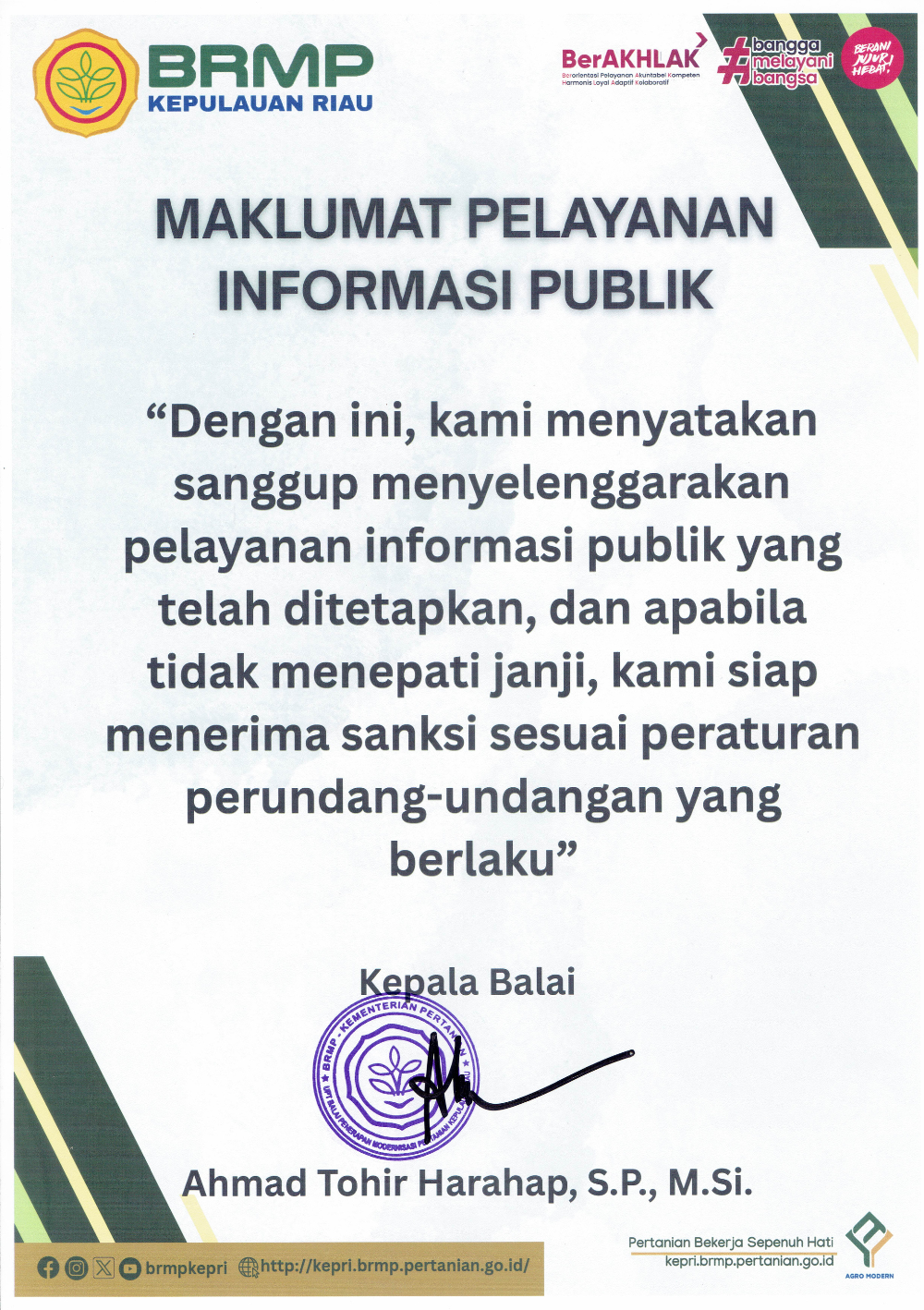 Sebagai badan publik, BRMP Kepulauan Riau berkomitmen menyelenggarakan pelayanan sesuai standar dan peraturan perundang-undangan. Kami memastikan setiap masyarakat dapat memperoleh layanan dengan mudah dan cepat. Komitmen ini tidak hanya menunjukkan dedikasi BRMP Kepulauan Riau dalam melayani masyarakat, tetapi juga menjadi cerminan dari upaya untuk meningkatkan kualitas layanan publik di sektor pertanian.